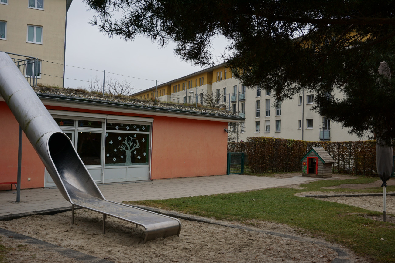 Das Außengelände besteht aus einem sonnigen Garten mit Kiefern und Sträuchern sowie einen zusammen mit den Kindern angelegten Beeren-, Blumen- und Obst Gemüsegarten. Im westlichen Teil des Gartens befindet sich der Spielbereich mit drei Sandkästen, einer Nestschaukel, zwei Rutschen (eine kleine, eine große von der Terrasse im OG in den Garten), einem Klettergerüst, drei Matschtischen, zwei Federwippen und einem Gartenhäuschen mit Bank und Tisch, in das sich die Kinder gern zurückziehen, auch zu Brotzeit. Als Sonnenschutz dienen uns eine Markise über dem großen Sandkasten und zwei fest installierte Sonnenschirme.