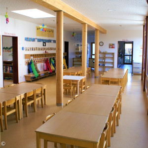 Neben den vier Gruppenräumen steht ihnen ein Lesezimmer mit großer Bücherauswahl, ein Werkraum, ein Atelier, ein großer Bewegungsraum, ein großer Garten und ein Innenhof zur Verfügung. Fast alle Räume im Kindergarten- und Vorschulbereich sind direkt miteinander verbunden und damit leicht einsehbar. Dadurch ist es dem pädagogischen Personal möglich, einen guten Überblick zu behalten und auch Kinder, die sich zurückziehen wollen, indirekt zu beaufsichtigen. Zusätzlich haben wir noch einen Raum mit Klavier und weiteren Instrumenten, der bietet Platz für spezielle Angebote z.B. die musikalische Bildung oder die Arbeit mit den Vorschulkindern. Außerdem kann er auch als Seminarraum genutzt werden. Eine große lichtdurchflutete Kinderkantine bietet den Kindern ausreichend Platz für ein warmes Mittagessen und Feste und Feiern. Unser Bibelgarten - ein Wintergarten - dient uns als Ort der Ruhe, der Betrachtung und Besinnlichkeit. Wir nutzen ihn gerne für die religiöse Erziehung und Andachten mit dem Pfarrer.